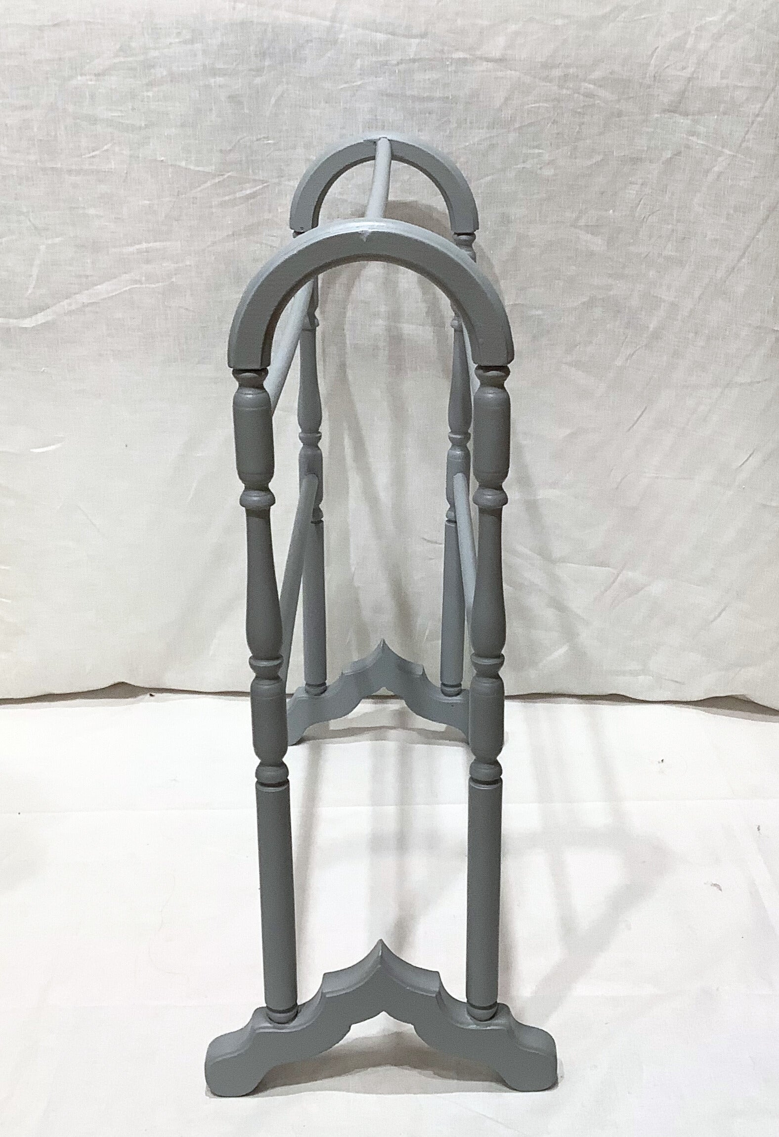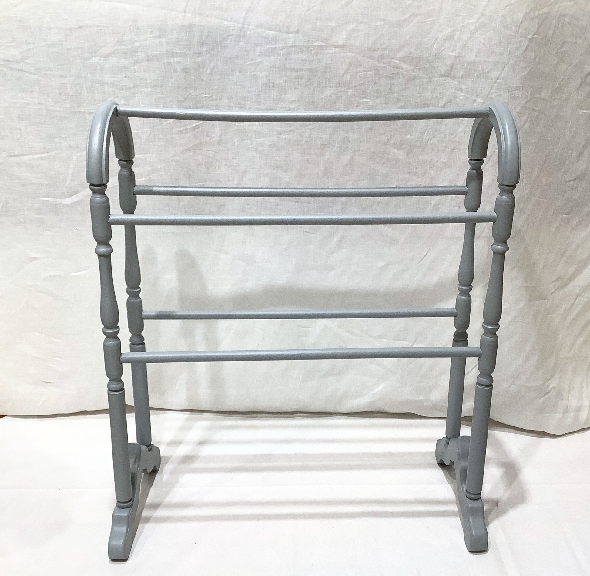 Lovely vintage wood towel rack. Weatherly Design had it restored and painted in a flat grey. Rack is still useful and would add a decorative touch to a bathroom.