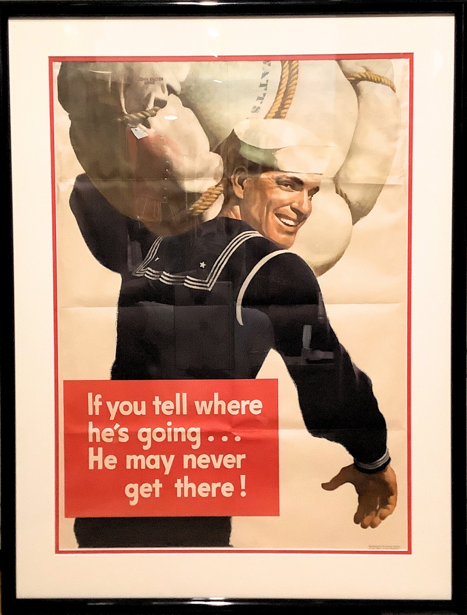 Original chromolithograph poster from WWII, “If you tell where he’s going….he may never get there” was commissioned by the Office of War Information, and created by advertising artist John Philips Falter. Similar to the famous slogan "Loose Lips Sinks Ships", the purpose of this poster, with it's handsome, smiling sailor, was to warn the public not to discuss war information.