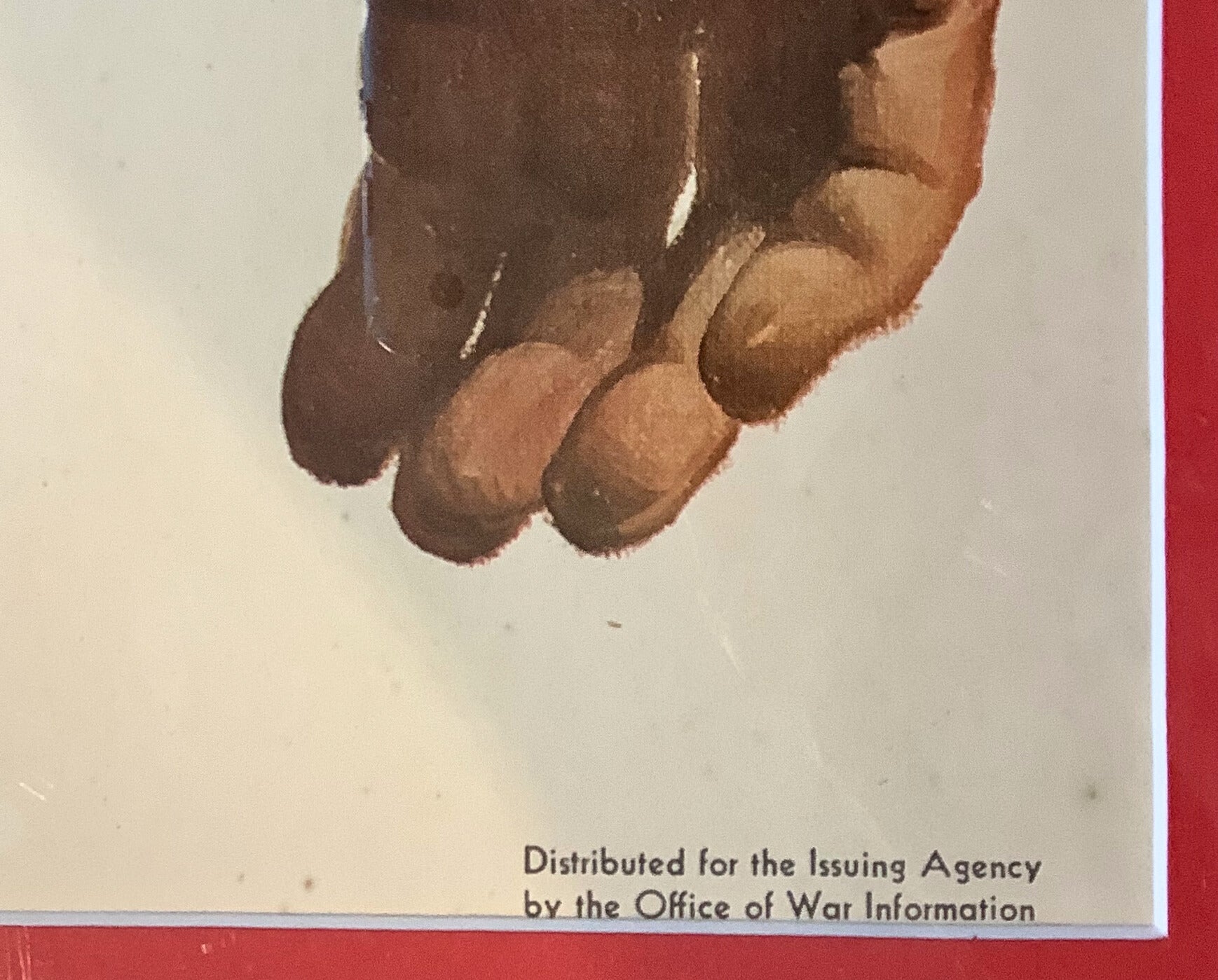 Posters were originally distributed in the 1940s, by the Office of War Information, with folds, so the creases seen are indicative of its authenticity. The mounting and framing are museum quality. The size is 34" x 25.5".