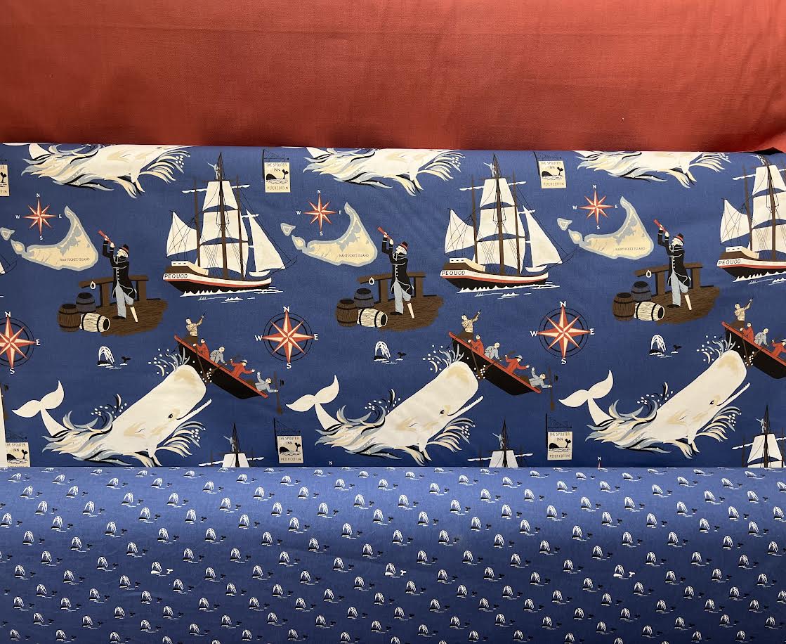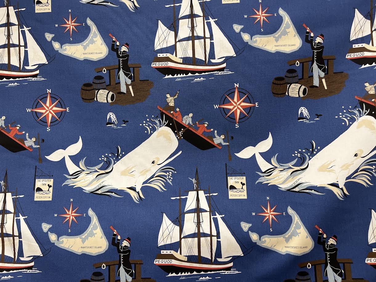 Moby Dick Toile is a 6 color print fabric on white ground. 100% cotton. For upholstery & window treatments. This toile is inspired by a classic mid-century fabric once popular for seaside homes in New England. Our fabric has been redesigned and made with classic screen printing - all in the USA. 53" wide (not including selvage), 17 1/2" Vertical Repeat, 17 3/4" Horizontal Repeat. Sold by the yard.