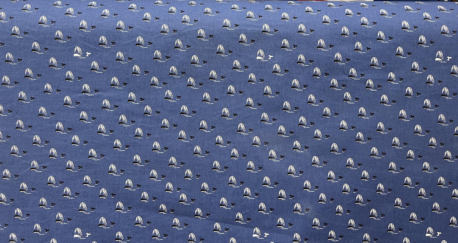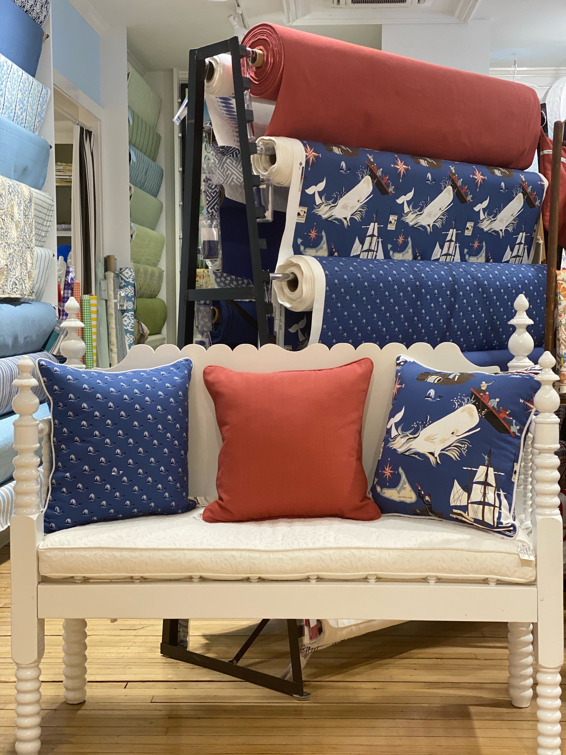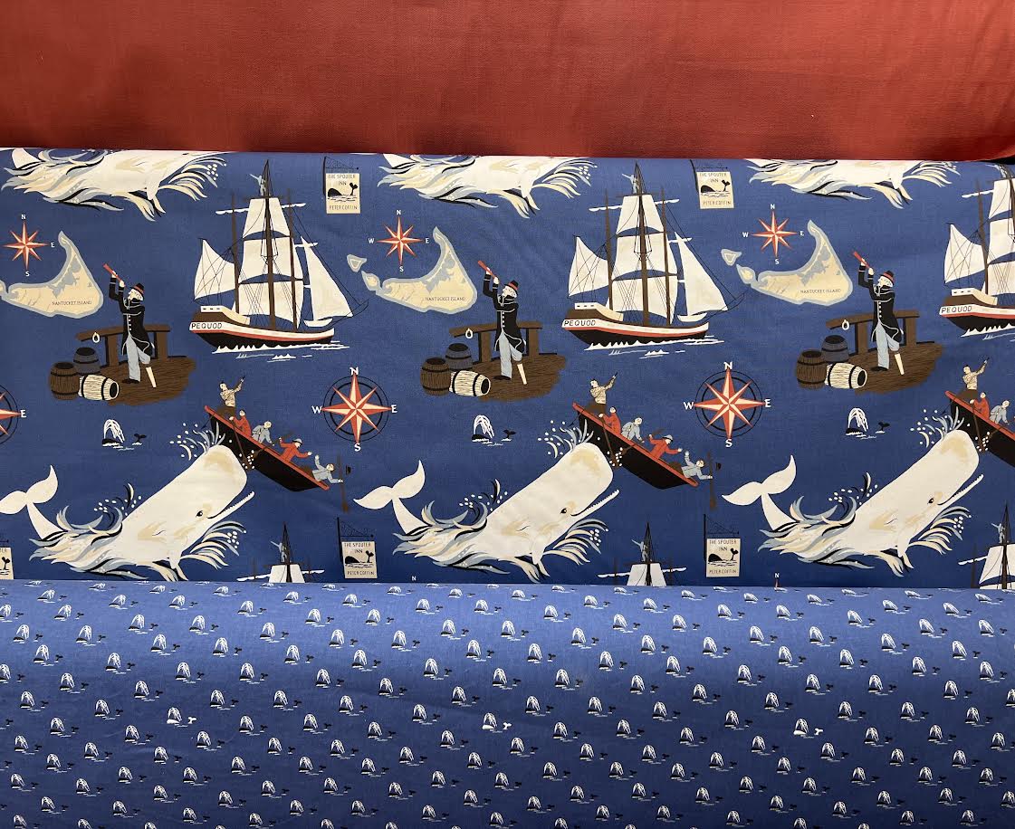WD's small scale Whales fabric is a 3 color print on white ground. 100% cotton. For upholstery & window treatments. This fabric is a coordinate fabric to the Moby Dick Toile. If you look closely you will see a white whale interspersed with black ones. Our fabric has been designed & made with classic screen printing - all in the USA. 53" wide (not including selvage), 3" repeat. Sold by the yard.